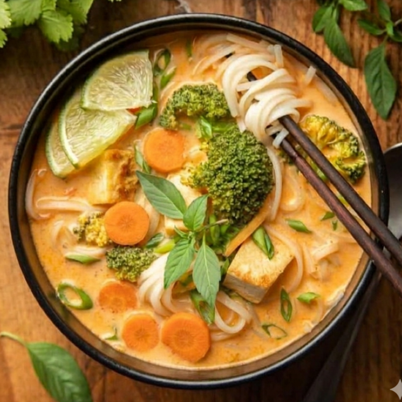 rice noodles, green beans, broccoli, carrots, kale, onions, ginger, bell pepper, celery, cilantro, lime, red curry paste, coconut milk, coconut oil, salt & pepper